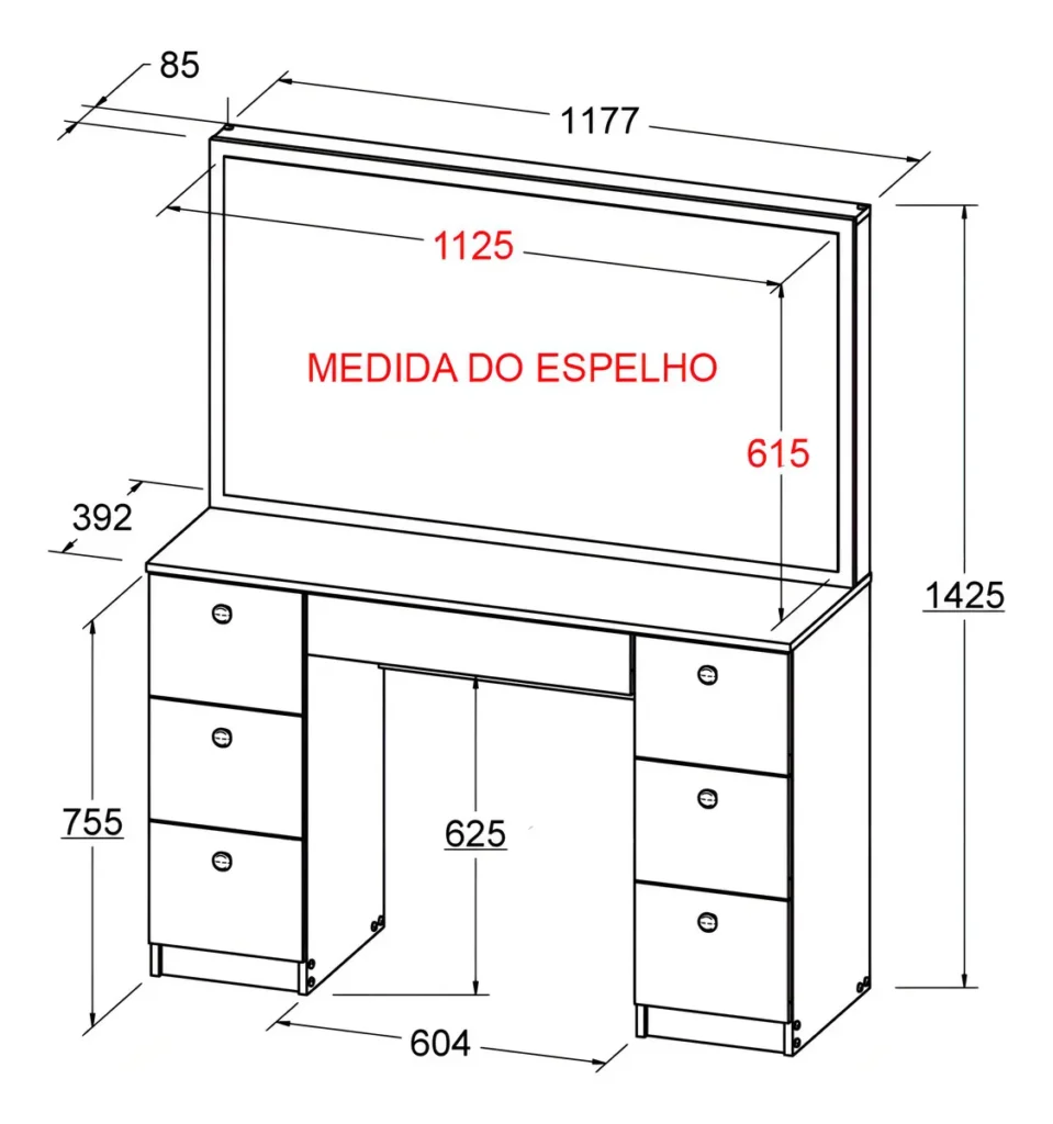 - Altura: 142.5 cm. | Feito em mdf/mdp. | Tem 7 gavetas. | Inclui espelho. | Corrediças metalicas. | Acabamento fosco.
